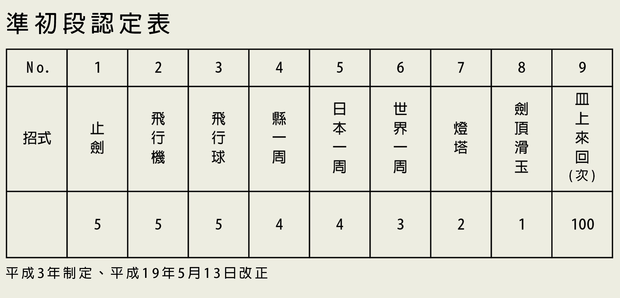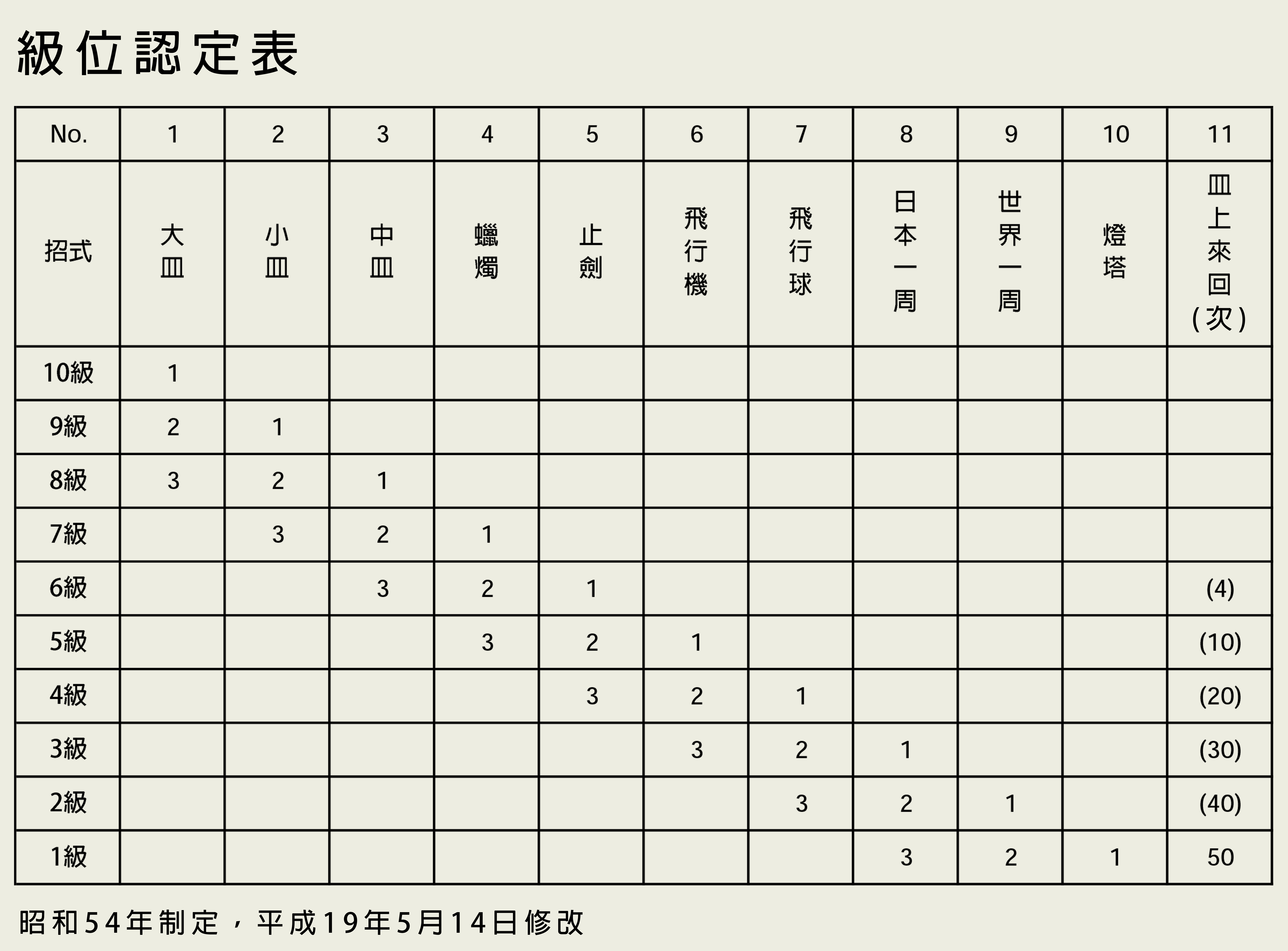 4. (No.1~No.10的招式)最多可做10次,而1級的No.11「皿上來回」只有2次機會。(No.1~No.10的招式)只需完成認定表上的次數就無需繼續,完成每個級位的指定次數即可合格。