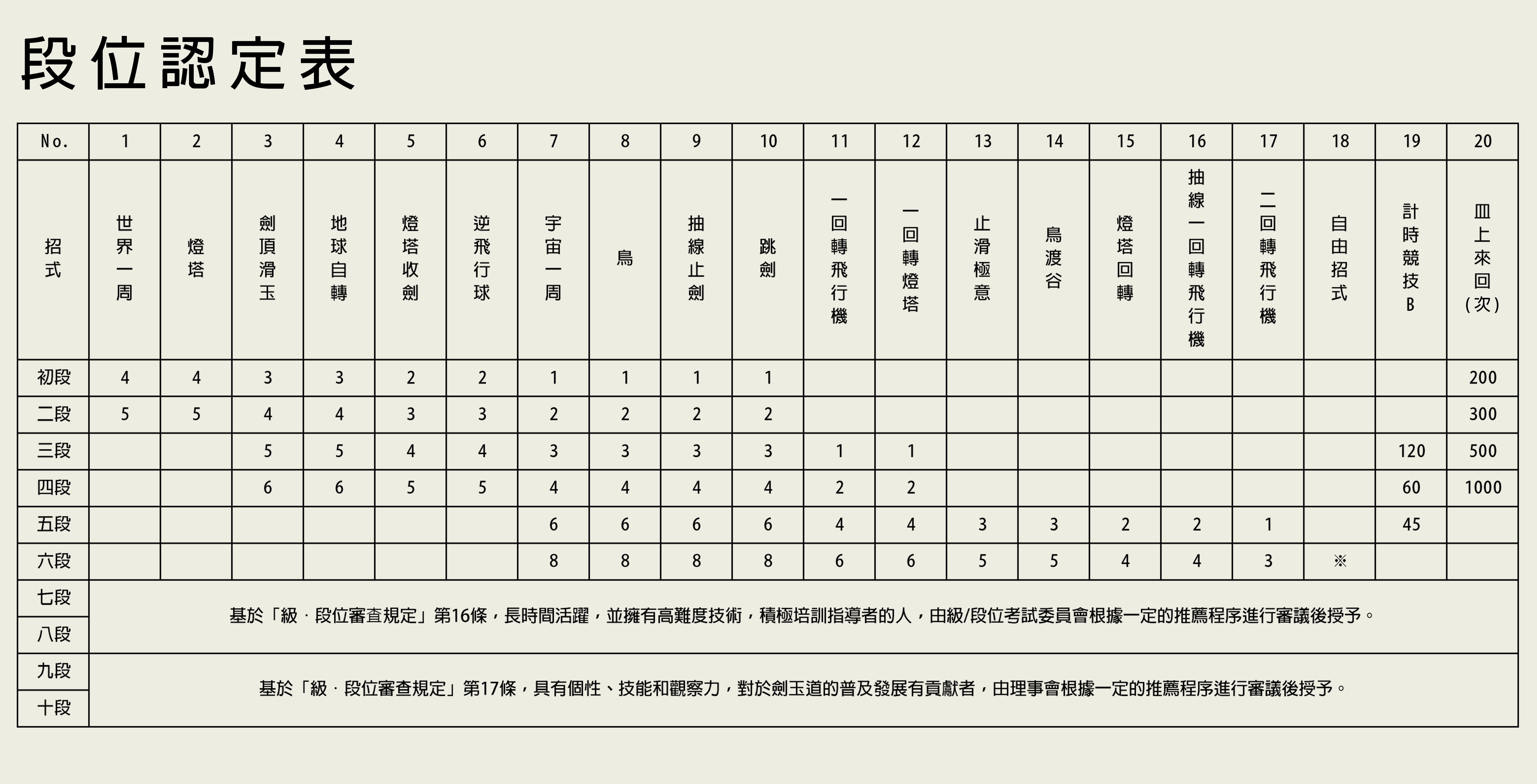 4. 在初段至五段的認定試中,不同受審段位的招式(No.1~No.17、No.19、No.20)會有不同程度的成功次數,要在所限次數內完成才算「合格」,而「計時競技B」要於規定時間內完成。 各類招式的可做次數會有不同,No.1~No.17的招式最多可做10次,「計時競技B」可做2次,皿上來回只能做1次。 另外,No.1~No.17的招式,只要在規定次數內完成就無須繼續。