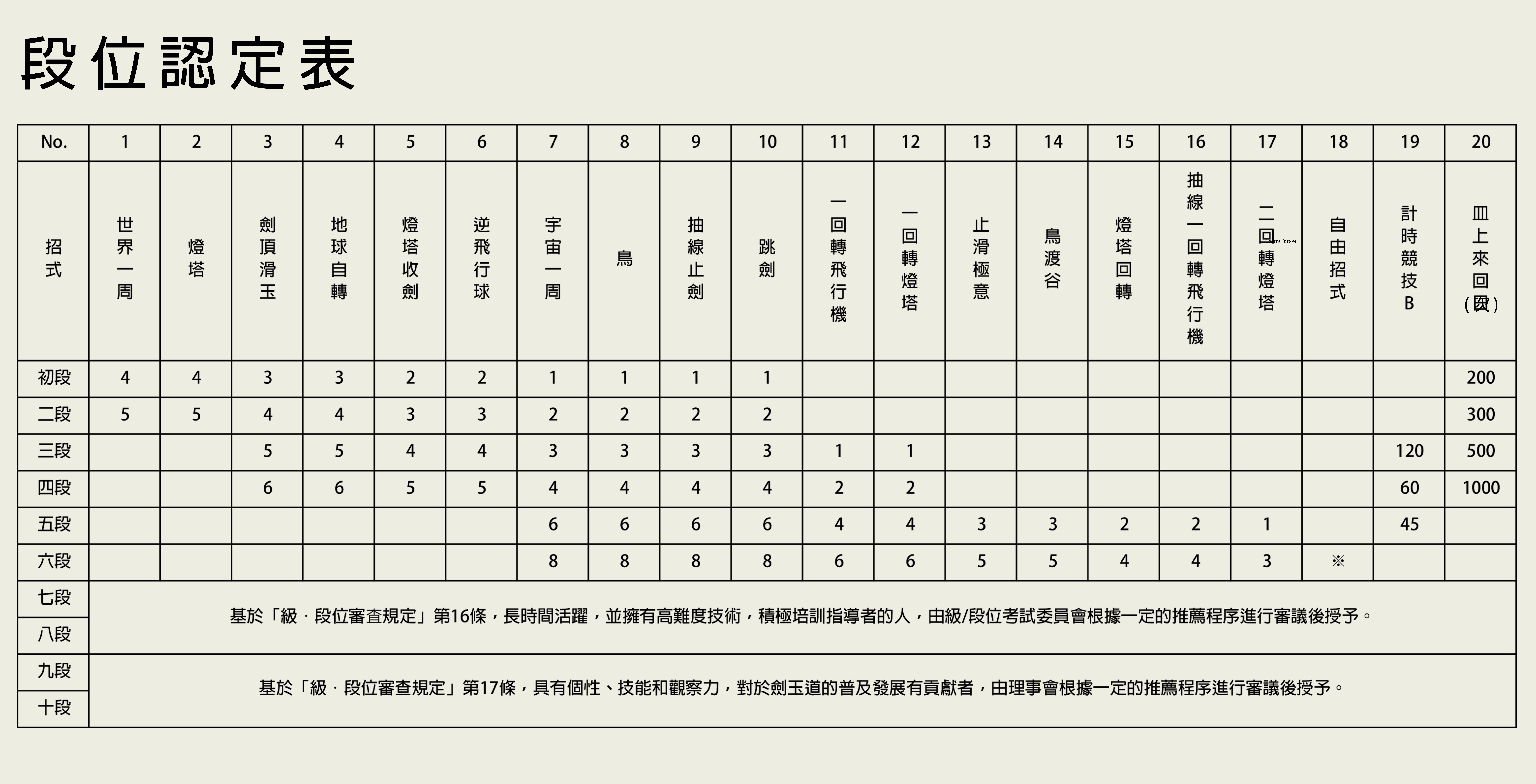 - 各段位受審招式必須順序進行。(例:考三段段位要由No.3開始,完成後順序做No.4、No.5等)
